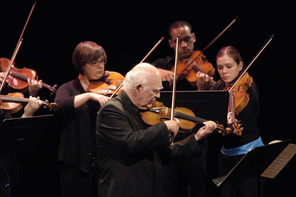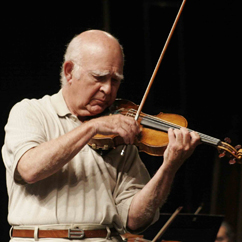 如果用最简单的一个 image 来说明的话,其实 Silverstein 的 bow arm 姿势跟 Joseph Joachim 和 Leonidas Kavakos 颇为类似,都是比较偏向 low elbow position,只是没有他们么低就是 (其实好像也没差多少??)。这样的右手演奏方式是以 Josef Gingold 一派为基础,他是法国小提琴学派重要历史人物 Ysaye 的学生,曾担任托斯卡尼尼麾下 NBC 交响乐团一员,与 George Szell 时代的克利夫兰管弦乐团首席;他的名徒包括 Silverstein、Kavakos、Josua Bell、Mariam Fried、Jaime Laredo、胡乃元。这种发音的首要条件是,你必须懂得利用"重量"。也就是说,你不能让整个人的重心,都存放在上半身,甚至是胸口以上的位置。我知道这样说满玄的,但不管你是要想象"气场"或是"地心引力",总之全身的肌肉必须放松,让身体内那种隐形的重量,完完全全扎扎实实地传到地板去。所以,良好的站姿跟挺拔的背部姿势是很重要的,可以确保脖子、肩膀、背部、双手双臂都是放松的。